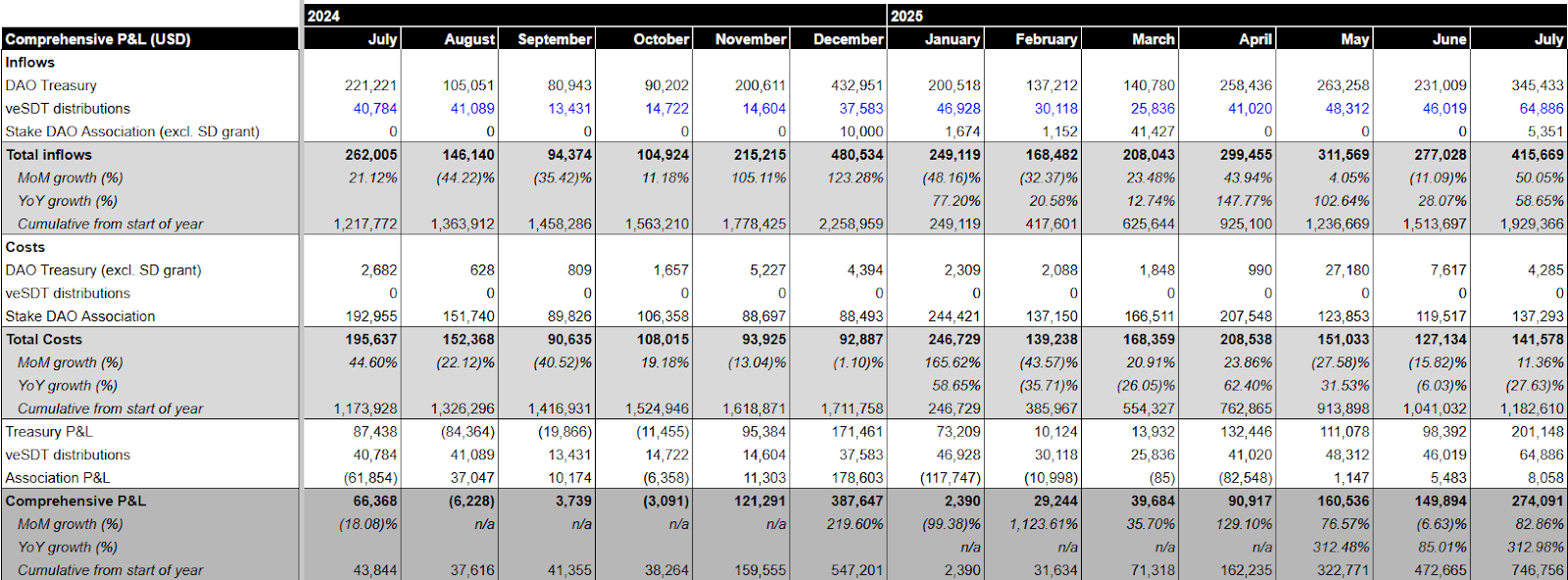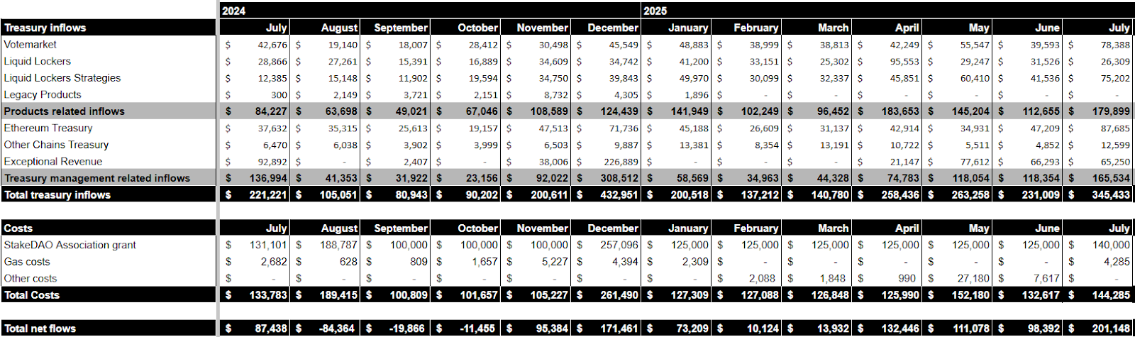 The strong market trend and CRV price action, supported by the very solid development of Stake DAO strategies, led to a steep increase in Votemarket and Strategies output, as well as an increase in treasury inflows in July which reached it’s second highest mark ever, after December 2024 which was mainly driven by exceptional inflows.
